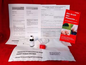 Das Probenfläschchen sollte zur Entbindung mitgenommen werden, dann kann unmittelbar nach der Geburt ein ca. erbsengroßes Stückchen aus der Plazenta herausgeschnitten und in das Glasfläschchen