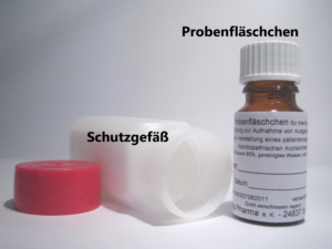 damit die eindeutige Zuordnung zum Auftrag gewährleistet ist. Dann wird das fest verschlossene Glasfläschchen mit der Plazentaprobe in das als Transportschutz gedachte Kunststoffgefäß gegeben.